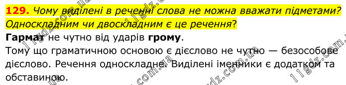 129. Чому виділені в реченні слова не можна вважати підметами? Односкладним чи двоскладним є це речення? Гармат не чутно від ударів грому. Тому що граматичною основою є дієслово не чутно — безособове дієслово. Речення односкладне. Виділені іменники є додатком та обставиною.