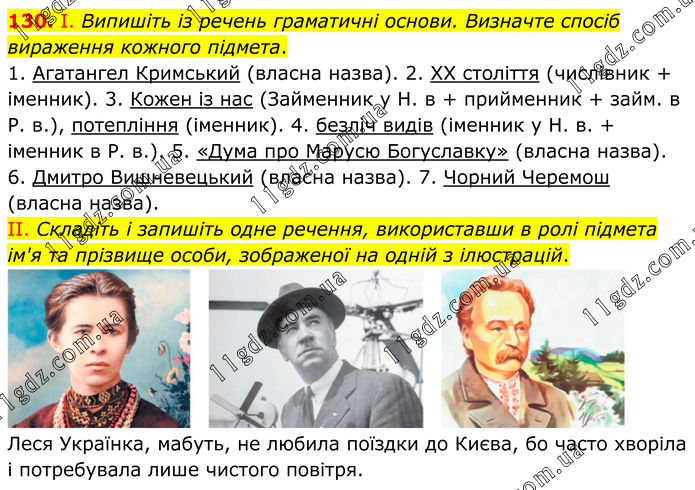 130. І. Випишіть із речень граматичні основи. Визначте спосіб вираження кожного підмета. 1. Агатангел Кримський (власна назва). 2. XX століття (числівник + іменник). 3. Кожен із нас (Займенник у Н. в + прийменник + займ. в Р. в.), потепління (іменник). 4. безліч видів (іменник у Н. в. + іменник в Р. в.). 5. «Дума про Марусю Богуславку» (власна назва). 6. Дмитро Вишневецький (власна назва). 7. Чорний Черемош (власна назва). II. Складіть і запишіть одне речення, використавши в ролі підмета ім'я та прізвище особи, зображеної на одній з ілюстрацій. Леся Українка, мабуть, не любила поїздки до Києва, бо часто хворіла і потребувала лише чистого повітря.