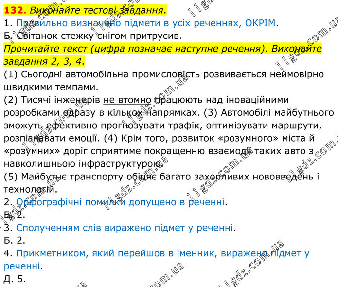 132. Виконайте тестові завдання. 1. Правильно визначено підмети в усіх реченнях, ОКРІМ. Б. Світанок стежку снігом притрусив. Прочитайте текст (цифра позначає наступне речення). Виконайте завдання 2, 3, 4. (1) Сьогодні автомобільна промисловість розвивається неймовірно швидкими темпами. (2) Тисячі інженерів не втомно працюють над іноваційними розробками одразу в кількох напрямках. (3) Автомобілі майбутнього зможуть ефективно прогнозувати трафік, оптимізувати маршрути, розпізнавати емоції. (4) Крім того, розвиток «розумного» міста й «розумних» доріг сприятиме покращенню взаємодії таких авто з навколишньою інфраструктурою. (5) Майбутнє транспорту обіцяє багато захопливих нововведень і технологій. 2. Орфографічні помилки допущено в реченні. Б. 2. 3. Сполученням слів виражено підмет у реченні. Б. 2. 4. Прикметником, який перейшов в іменник, виражено підмет у реченні. Д. 5.