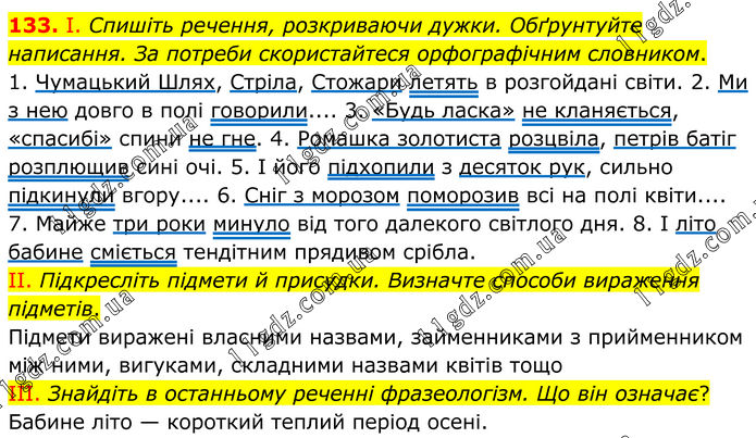 133. І. Спишіть речення, розкриваючи дужки. Обґрунтуйте написання. За потреби скористайтеся орфографічним словником. 1. Чумацький Шлях, Стріла, Стожари летять в розгойдані світи. 2. Ми з нею довго в полі говорили.... 3. «Будь ласка» не кланяється, «спасибі» спини не гне. 4. Ромашка золотиста розцвіла, петрів батіг розплющив сині очі. 5. І його підхопили з десяток рук, сильно підкинули вгору.... 6. Сніг з морозом поморозив всі на полі квіти.... 7. Майже три роки минуло від того далекого світлого дня. 8. І літо бабине сміється тендітним прядивом срібла. II. Підкресліть підмети й присудки. Визначте способи вираження підметів. Підмети виражені власними назвами, займенниками з прийменником між ними, вигуками, складними назвами квітів тощо. III. Знайдіть в останньому реченні фразеологізм. Що він означає? Бабине літо — короткий теплий період осені.
