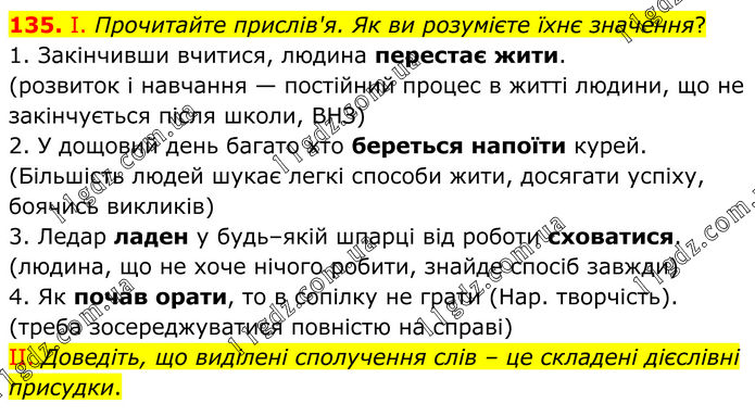 135. І. Прочитайте прислів'я. Як ви розумієте їхнє значення? 1. Закінчивши вчитися, людина перестає жити. (розвиток і навчання — постійний процес в житті людини, що не закінчується після школи, ВНЗ) 2. У дощовий день багато хто береться напоїти курей. (Більшість людей шукає легкі способи жити, досягати успіху, боячись викликів) 3. Ледар ладен у будь–якій шпарці від роботи сховатися. (людина, що не хоче нічого робити, знайде спосіб завжди) 4. Як почав орати, то в сопілку не грати (Нар. творчість). (треба зосереджуватися повністю на справі) II. Доведіть, що виділені сполучення слів – це складені дієслівні присудки.