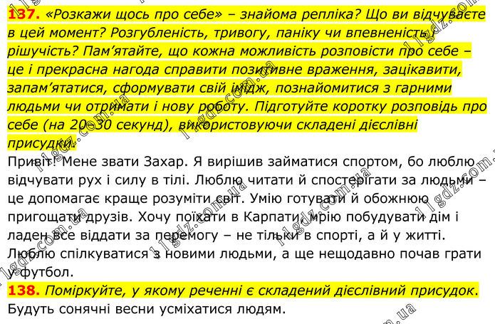 137. «Розкажи щось про себе» – знайома репліка? Що ви відчуваєте в цей момент? Розгубленість, тривогу, паніку чи впевненість і рішучість? Пам’ятайте, що кожна можливість розповісти про себе – це і прекрасна нагода справити позитивне враження, зацікавити, запам’ятатися, сформувати свій імідж, познайомитися з гарними людьми чи отримати і нову роботу. Підготуйте коротку розповідь про себе (на 20–30 секунд), використовуючи складені дієслівні присудки. Привіт! Мене звати Захар. Я вирішив займатися спортом, бо люблю відчувати рух і силу в тілі. Люблю читати й спостерігати за людьми – це допомагає краще розуміти світ. Умію готувати й обожнюю пригощати друзів. Хочу поїхати в Карпати, мрію побудувати дім і ладен все віддати за перемогу – не тільки в спорті, а й у житті. Люблю спілкуватися з новими людьми, а ще нещодавно почав грати у футбол. 138. Поміркуйте, у якому реченні є складений дієслівний присудок. Будуть сонячні весни усміхатися людям.