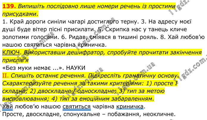 139. Випишіть послідовно лише номери речень із простими присудками. 1. Край дороги синіли чагарі достиглого терну. 3. На адресу моєї душі буде вітер пісні присилати. 5. Скрипка нас у танець кличе золотими голосами. 6. Ридав, сміявся в тишині рояль. 8. Хай любов’ю нашою святиться чарівна криничка. КЛЮЧ. Використавши дешифратор, спробуйте прочитати закінчення прислів’я «Без муки немає ...». НАУКИ II. Спишіть останнє речення. Підкресліть граматичну основу. Схарактеризуйте речення за такими критеріями: 1) просте І складне; 2) двоскладне / односкладне; 3) тип за метою висловлювання; 4) тип за емоційним забарвленням. Хай любов’ю нашою святиться чарівна криничка. Просте, двоскладне, спонукальне – побажання, неокличне.