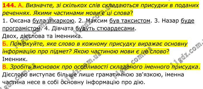 144. А. Визначте, зі скількох слів складаються присудки в поданих реченнях. Якими частинами мови є ці слова? 1. Оксана була лікаркою. 2. Максим був таксистом. 3. Назар буде програмістом. 4. Дівчата будуть стюардесами. Двох, дієслова та іменника. Б. Поміркуйте, яке слово в кожному присудку виражає основну інформацію про підмет? Якою частиною мови є це слово? Іменник. В. Зробіть висновок про особливості складеного іменного присудка. Дієслово виступає більше лише граматичною зв'язкою, іменна частина несе в собі основну інформацію про дію.