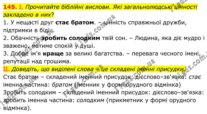 145. І. Прочитайте біблійні вислови. Які загальнолюдські цінності закладено в них? 1. У нещасті друг стає братом. – цінність справжньої дружби, підтримки в біді. 2. Обачність зробить солодким твій сон. – Людина, яка діє мудро і зважено, матиме спокій у душі. 3. Добре ім’я краще за великі багатства. – перевага чесного імені, репутації над грошима. ІІ. Доведіть, що виділені слова – це складені іменні присудки. Стає братом – складений іменний присудок: дієслово–зв'язка: стає іменна частина: братом (іменник у формі орудного відмінка) Зробить солодким – складений іменний присудок: дієслово–зв'язка: зробить іменна частина: солодким (прикметник у формі орудного відмінка).