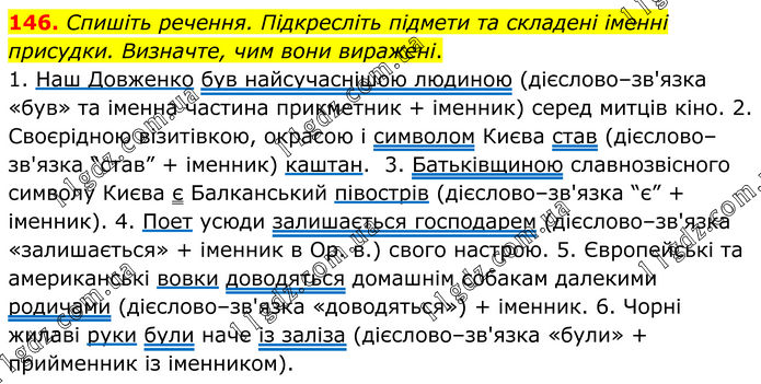 146. Спишіть речення. Підкресліть підмети та складені іменні присудки. Визначте, чим вони виражені. 1. Наш Довженко був найсучаснішою людиною (дієслово–зв'язка «був» та іменна частина прикметник + іменник) серед митців кіно. 2. Своєрідною візитівкою, окрасою і символом Києва став (дієслово–зв'язка “став” + іменник) каштан. 3. Батьківщиною славнозвісного символу Києва є Балканський півострів (дієслово–зв'язка “є” + іменник). 4. Поет усюди залишається господарем (дієслово–зв'язка «залишається» + іменник в Ор. в.) свого настрою. 5. Європейські та американські вовки доводяться домашнім собакам далекими родичами (дієслово–зв'язка «доводяться») + іменник. 6. Чорні жилаві руки були наче із заліза (дієслово–зв'язка «були» + прийменник із іменником).