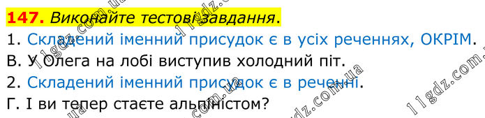 147. Виконайте тестові завдання. 1. Складений іменний присудок є в усіх реченнях, ОКРІМ. В. У Олега на лобі виступив холодний піт. 2. Складений іменний присудок є в реченні. Г. І ви тепер стаєте альпіністом?