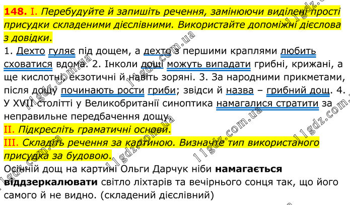 148. І. Перебудуйте й запишіть речення, замінюючи виділені прості присудки складеними дієслівними. Використайте допоміжні дієслова з довідки. 1. Дехто гуляє під дощем, а дехто з першими краплями любить сховатися вдома. 2. Інколи дощі можуть випадати грибні, крижані, а ще кислотні, екзотичні й навіть зоряні. 3. За народними прикметами, після дощу починають рости гриби; звідси й назва – грибний дощ. 4. У XVII столітті у Великобританії синоптика намагалися стратити за неправильне передбачення дощу. II. Підкресліть граматичні основи. III. Складіть речення за картиною. Визначте тип використаного присудка за будовою. Осінній дощ на картині Ольги Дарчук ніби намагається віддзеркалювати світло ліхтарів та вечірнього сонця так, що його самого й не видно. (складений дієслівний)