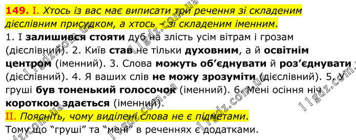 149. І. Хтось із вас має виписати три речення зі складеним дієслівним присудком, а хтось – зі складеним іменним. 1. І залишився стояти дуб на злість усім вітрам і грозам (дієслівний). 2. Київ став не тільки духовним, а й освітнім центром (іменний). 3. Слова можуть об’єднувати й роз’єднувати (дієслівний). 4. Я ваших слів не можу зрозуміти (дієслівний). 5. У груші був тоненький голосочок (іменний). 6. Мені осіння ніч короткою здається (іменний). II. Поясніть, чому виділені слова не є підметами. Тому що “груші” та “мені” в реченнях є додатками.