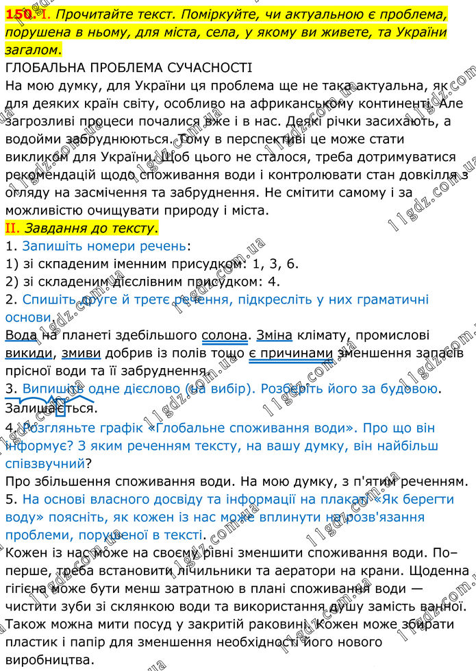 150. І. Прочитайте текст. Поміркуйте, чи актуальною є проблема, порушена в ньому, для міста, села, у якому ви живете, та України загалом. ГЛОБАЛЬНА ПРОБЛЕМА СУЧАСНОСТІ На мою думку, для України ця проблема ще не така актуальна, як для деяких країн світу, особливо на африканському континенті. Але загрозливі процеси почалися вже і в нас. Деякі річки засихають, а водойми забруднюються. Тому в перспективі це може стати викликом для України. Щоб цього не сталося, треба дотримуватися рекомендацій щодо споживання води і контролювати стан довкілля з огляду на засмічення та забруднення. Не смітити самому і за можливістю очищувати природу і міста. II. Завдання до тексту. 1. Запишіть номери речень: 1) зі скпаденим іменним присудком: 1, 3, 6. 2) зі складеним дієслівним присудком: 4. 2. Спишіть друге й третє речення, підкресліть у них граматичні основи. Вода на планеті здебільшого солона. Зміна клімату, промислові викиди, змиви добрив із полів тощо є причинами зменшення запасів прісної води та її забруднення. 3. Випишіть одне дієслово (на вибір). Розберіть його за будовою. Залишається. 4. Розгляньте графік «Глобальне споживання води». Про що він інформує? З яким реченням тексту, на вашу думку, він найбільш співзвучний? Про збільшення споживання води. На мою думку, з п'ятим реченням. 5. На основі власного досвіду та інформації на плакаті «Як берегти воду» поясніть, як кожен із нас може вплинути на розв'язання проблеми, порушеної в тексті. Кожен із нас може на своєму рівні зменшити споживання води. По–перше, треба встановити лічильники та аератори на крани. Щоденна гігієна може бути менш затратною в плані споживання води — чистити зуби зі склянкою води та використання душу замість ванної. Також можна мити посуд у закритій раковині. Кожен може збирати пластик і папір для зменшення необхідності його нового виробництва.