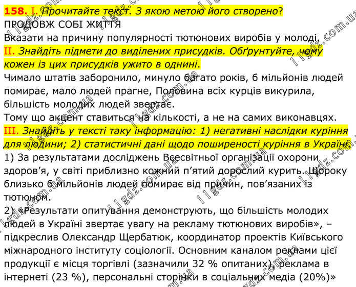 158. І. Прочитайте текст. З якою метою його створено? ПРОДОВЖ СОБІ ЖИТТЯ Вказати на причину популярності тютюнових виробів у молоді. II. Знайдіть підмети до виділених присудків. Обґрунтуйте, чому кожен із цих присудків ужито в однині. Чимало штатів заборонило, минуло багато років, б мільйонів людей помирає, мало людей прагне, Половина всіх курців викурила, більшість молодих людей звертає. Тому що акцент ставиться на кількості, а не на самих виконавцях. III. Знайдіть у тексті таку інформацію: 1) негативні наслідки куріння для людини; 2) статистичні дані щодо поширеності куріння в Україні. 1) За результатами досліджень Всесвітньої організації охорони здоров’я, у світі приблизно кожний п’ятий дорослий курить. Щороку близько б мільйонів людей помирає від причин, пов’язаних із тютюном. 2) «Результати опитування демонструють, що більшість молодих людей в Україні звертає увагу на рекламу тютюнових виробів», – підкреслив Олександр Щербатюк, координатор проектів Київського міжнародного інституту соціології. Основним каналом реклами цієї продукції є місця торгівлі (зазначили 32 % опитаних), реклама в інтернеті (23 %), персональні сторінки в соціальних медіа (20%)»