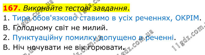 167. Виконайте тестові завдання. 1. Тире обов'язково ставимо в усіх реченнях, ОКРІМ. В. Голодному світ не милий. 2. Пунктуаційну помилку допущено в реченні. В. Ніч ночувати не вік горювати.