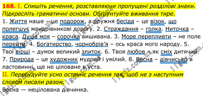 168. І. Спишіть речення, розставляючи пропущені розділові знаки. Підкресліть граматичні основи. Обґрунтуйте вживання тире. 1. Життя наше – це подорож, а дружня бесіда – це візок, що полегшує мандрівникові дорогу. 2. Страждання – голка. Ниточка – краса. Душа моя – сорочка вишивана. 3. Море перепливти – не поле перейти. 4. Богатирство, чорнобрів’я – ось краса мого народу. 5. Твої вірші – думок великий злиток. 6. Твоя любов – як сміх дитячий. 7. Природа – це художник мудрий і умілий. 8. Весна – дівчисько в ластовинні, ще не ціловане в уста. II. Перебудуйте усно останнє речення так, щоб не з наступним словом писали разом. Весна — нецілована дівчинка.