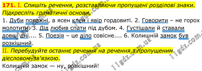 171. І. Спишіть речення, розставляючи пропущені розділові знаки. Підкресліть граматичні основи. 1. Дуби поважні, а ясен клен і явір гордовиті. 2. Говорити – не горох молотити. 3. Дід любив спати під дубом. 4. Густішали й ставали довші дні.... 5. Поезія – це діло совісне.... 6. Колишній замок був розкішний. II. Перебудуйте останнє речення на речення з пропущеним дієсловом–зв'язкою. Колишній замок — ну, розкішний!