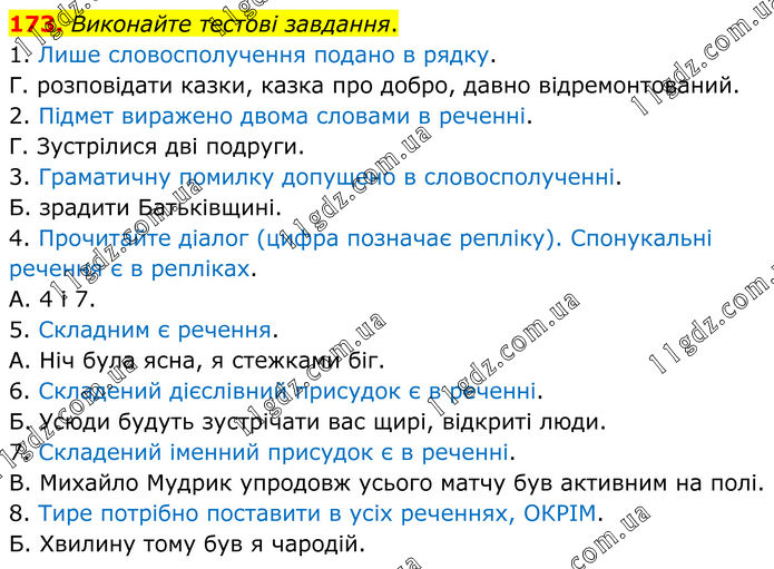173. Виконайте тестові завдання. 1. Лише словосполучення подано в рядку. Г. розповідати казки, казка про добро, давно відремонтований. 2. Підмет виражено двома словами в реченні. Г. Зустрілися дві подруги. 3. Граматичну помилку допущено в словосполученні. Б. зрадити Батьківщині. 4. Прочитайте діалог (цифра позначає репліку). Спонукальні речення є в репліках. А. 4 і 7. 5. Складним є речення. А. Ніч була ясна, я стежками біг. 6. Складений дієслівний присудок є в реченні. Б. Усюди будуть зустрічати вас щирі, відкриті люди. 7. Складений іменний присудок є в реченні. В. Михайло Мудрик упродовж усього матчу був активним на полі. 8. Тире потрібно поставити в усіх реченнях, ОКРІМ. Б. Хвилину тому був я чародій.