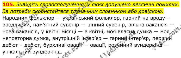 105. Знайдіть словосполучення, у яких допущено лексичні помилки. За потреби скористайтеся тлумачним словником або довідкою. Народним фольклор – український фольклор, гарний на вроду – вродливий, пам’ятний сувенір — цінний сувенір, вільна вакансія — нова вакансія, у квітні місяці — в квітні, моя власна думка — моя неповторна думка, внутрішній інтер’єр — гарний інтер'єр, перший дебют – дебют, бурхливі овації — овації, розумний вундеркінд — унікальний вундеркінд.