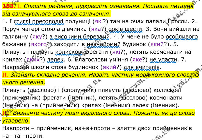 183. І. Спишіть речення, підкресліть означення. Поставте питання від означуваного слова до означення. 1. І стиглі пресолодкі полуниці (які?) там на очах палали і росли. 2. Поруч матері стояла дівчинка (яка?) років шести. 3. Вони вийшли на галявину (яку?) з високими березами. 4. У мене не було особливого бажання (якого?) заходити в незнайомий будинок (який?). 5. Пливуть і пливуть колискові фрегати (які?), летять космонавти на крилах (яких?) лелек. 6. Благослови уміння (яке?) не упасти. 7. Навпроти школи стояв будиночок (який?) для вчителів. II. Знайдіть складне речення. Назвіть частину мови кожного слова із цього речення. Пливуть (дієслово) і (сполучник) пливуть (дієслово) колискові (прикметник) фрегати (іменник), летять (дієслово) космонавти (іменник) на (прийменник) крилах (іменник) лелек (іменник). III. Визначте частину мови виділеного слова. Поясніть, як це слово утворено. Навпроти – прийменник, на+в+проти – злиття двох прийменників на– та –проти.