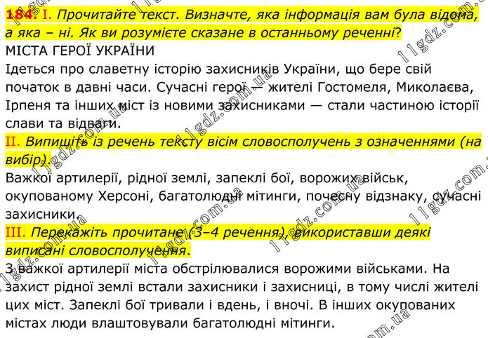 184. І. Прочитайте текст. Визначте, яка інформація вам була відома, а яка – ні. Як ви розумієте сказане в останньому реченні? МІСТА ГЕРОЇ УКРАЇНИ Ідеться про славетну історію захисників України, що бере свій початок в давні часи. Сучасні герої — жителі Гостомеля, Миколаєва, Ірпеня та інших міст із новими захисниками — стали частиною історії слави та відваги. II. Випишіть із речень тексту вісім словосполучень з означеннями (на вибір). Важкої артилерії, рідної землі, запеклі бої, ворожих військ, окупованому Херсоні, багатолюдні мітинги, почесну відзнаку, сучасні захисники. III. Перекажіть прочитане (3–4 речення), використавши деякі виписані словосполучення. З важкої артилерії міста обстрілювалися ворожими військами. На захист рідної землі встали захисники і захисниці, в тому числі жителі цих міст. Запеклі бої тривали і вдень, і вночі. В інших окупованих містах люди влаштовували багатолюдні мітинги.