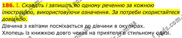 186. І. Складіть і запишіть по одному реченню за кожною ілюстрацією, використовуючи означення. За потреби скористайтеся довідкою. Дівчина з квітами посміхається до дівчини в окулярах. Хлопець із книжкою довго чекав на приятеля в стильному одязі.