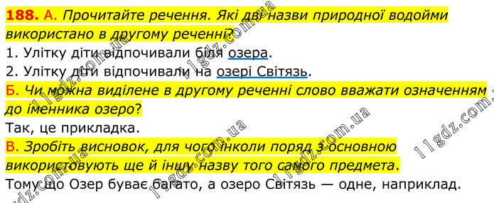 188. А. Прочитайте речення. Які дві назви природної водойми використано в другому реченні? 1. Улітку діти відпочивали біля озера. 2. Улітку діти відпочивали на озері Світязь. Б. Чи можна виділене в другому реченні слово вважати означенням до іменника озеро? Так, це прикладка. В. Зробіть висновок, для чого інколи поряд з основною використовують ще й іншу назву того самого предмета. Тому що Озер буває багато, а озеро Світязь — одне, наприклад.