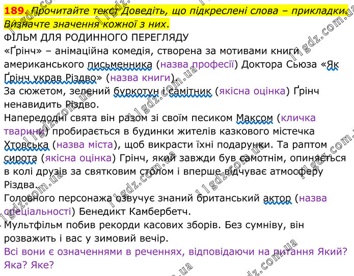 189. Прочитайте текст Доведіть, що підкреслені слова – прикладки. Визначте значення кожної з них. ФІЛЬМ ДЛЯ РОДИННОГО ПЕРЕГЛЯДУ «Ґрінч» – анімаційна комедія, створена за мотивами книги американського письменника (назва професії) Доктора Сьюза «Як Ґрінч украв Різдво» (назва книги). За сюжетом, зелений буркотун і самітник (якісна оцінка) Ґрінч ненавидить Різдво. Напередодні свята він разом зі своїм песиком Максом (кличка тварини) пробирається в будинки жителів казкового містечка Хтовська (назва міста), щоб викрасти їхні подарунки. Та раптом сирота (якісна оцінка) Грінч, який завжди був самотнім, опиняється в колі друзів за святковим столом і вперше відчуває атмосферу Різдва. Головного персонажа озвучує знаний британський актор (назва спеціальності) Бенедикт Камбербетч. Мультфільм побив рекорди касових зборів. Без сумніву, він розважить і вас у зимовий вечір. Всі вони є означеннями в реченнях, відповідаючи на питання Який? Яка? Яке?