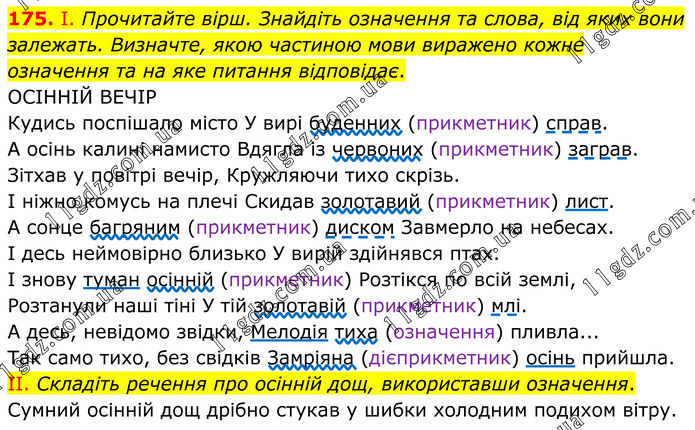 175. І. Прочитайте вірш. Знайдіть означення та слова, від яких вони залежать. Визначте, якою частиною мови виражено кожне означення та на яке питання відповідає. ОСІННІЙ ВЕЧІР Кудись поспішало місто У вирі буденних (прикметник) справ. А осінь калині намисто Вдягла із червоних (прикметник) заграв. Зітхав у повітрі вечір, Кружляючи тихо скрізь. І ніжно комусь на плечі Скидав золотавий (прикметник) лист. А сонце багряним (прикметник) диском Завмерло на небесах. І десь неймовірно близько У вирій здійнявся птах. І знову туман осінній (прикметник) Розтікся по всій землі, Розтанули наші тіні У тій золотавій (прикметник) млі. А десь, невідомо звідки, Мелодія тиха (означення) пливла... Так само тихо, без свідків Замріяна (дієприкметник) осінь прийшла. II. Складіть речення про осінній дощ, використавши означення. Сумний осінній дощ дрібно стукав у шибки холодним подихом вітру.