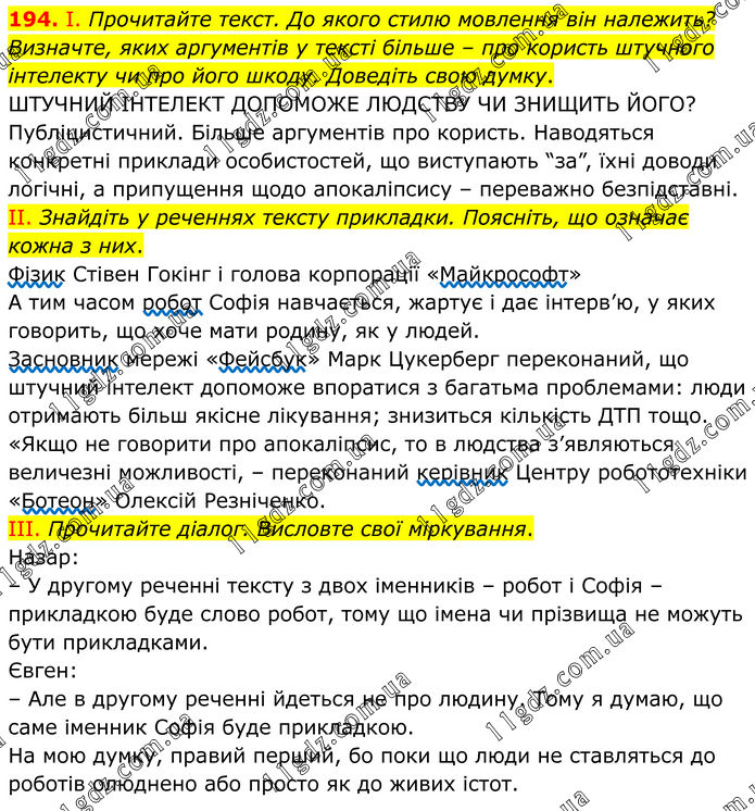 194. І. Прочитайте текст. До якого стилю мовлення він належить? Визначте, яких аргументів у тексті більше – про користь штучного інтелекту чи про його шкоду. Доведіть свою думку. ШТУЧНИЙ ІНТЕЛЕКТ ДОПОМОЖЕ ЛЮДСТВУ ЧИ ЗНИЩИТЬ ЙОГО? Публіцистичний. Більше аргументів про користь. Наводяться конкретні приклади особистостей, що виступають “за”, їхні доводи логічні, а припущення щодо апокаліпсису – переважно безпідставні. II. Знайдіть у реченнях тексту прикладки. Поясніть, що означає кожна з них. Фізик Стівен Гокінг і голова корпорації «Майкрософт» А тим часом робот Софія навчається, жартує і дає інтерв’ю, у яких говорить, що хоче мати родину, як у людей. Засновник мережі «Фейсбук» Марк Цукерберг переконаний, що штучний інтелект допоможе впоратися з багатьма проблемами: люди отримають більш якісне лікування; знизиться кількість ДТП тощо. «Якщо не говорити про апокаліпсис, то в людства з’являються величезні можливості, – переконаний керівник Центру робототехніки «Ботеон» Олексій Резніченко. III. Прочитайте діалог. Висловте свої міркування. Назар: – У другому реченні тексту з двох іменників – робот і Софія –прикладкою буде слово робот, тому що імена чи прізвища не можуть бути прикладками. Євген: – Але в другому реченні йдеться не про людину. Тому я думаю, що саме іменник Софія буде прикладкою. На мою думку, правий перший, бо поки що люди не ставляться до роботів олюднено або просто як до живих істот.