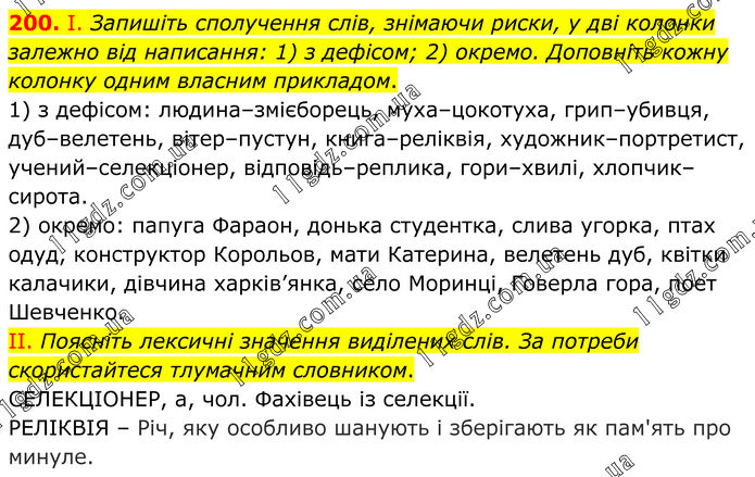 200. І. Запишіть сполучення слів, знімаючи риски, у дві колонки залежно від написання: 1) з дефісом; 2) окремо. Доповніть кожну колонку одним власним прикладом. 1) з дефісом: людина–змієборець, муха–цокотуха, грип–убивця, дуб–велетень, вітер–пустун, книга–реліквія, художник–портретист, учений–селекціонер, відповідь–реплика, гори–хвилі, хлопчик–сирота. 2) окремо: папуга Фараон, донька студентка, слива угорка, птах одуд, конструктор Корольов, мати Катерина, велетень дуб, квітки калачики, дівчина харків’янка, село Моринці, Говерла гора, поет Шевченко. II. Поясніть лексичні значення виділених слів. За потреби скористайтеся тлумачним словником. СЕЛЕКЦІОНЕР, а, чол. Фахівець із селекції. РЕЛІКВІЯ – Річ, яку особливо шанують і зберігають як пам'ять про минуле.
