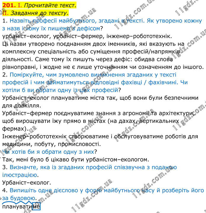 201. І. Прочитайте текст. II. Завдання до тексту. 1. Назвіть професії майбутнього, згадані в тексті. Як утворено кожну з назв і чому їх пишемо з дефісом? урбаніст–еколог, урбаніст–фермер, інженер–робототехнік. Ці назви утворено поєднанням двох іменників, які вказують на комплексну спеціальність або суміщення професій/напрямків діяльності. Саме тому їх пишуть через дефіс: обидва слова рівноправні, і жодне не є лише уточненням чи означенням до іншого. 2. Поміркуйте, чим зумовлено виникнення згаданих у тексті професій і чим займатимуться відповідні фахівці / фахівчині. Чи хотіли б ви обрати одну із цих професій? Урбаніст–еколог плануватиме міста так, щоб вони були безпечними для довкілля. Урбаніст–фермер поєднуватиме знання з агрономії та архітектури, щоб вирощувати їжу прямо в містах (на дахах, вертикальних фермах). Інженер–робототехнік створюватиме і обслуговуватиме роботів для медицини, побуту, промисловості. Чи хотів би я обрати одну з них? Так, мені було б цікаво бути урбаністом–екологом. 3. Визначте, яка із згаданих професій співзвучна з поданою ілюстрацією. Урбаніст–еколог. 4. Випишіть одне дієслово у формі майбутнього часу й розберіть його за будовою. плануватиме