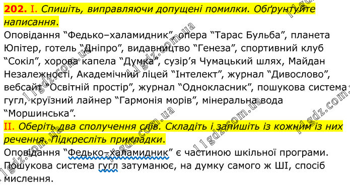202. І. Спишіть, виправляючи допущені помилки. Обґрунтуйте написання. Оповідання “Федько–халамидник”, опера “Тарас Бульба”, планета Юпітер, готель “Дніпро”, видавництво “Генеза”, спортивний клуб “Сокіл”, хорова капела “Думка”, сузір’я Чумацький шлях, Майдан Незалежності, Академічний ліцей “Інтелект”, журнал “Дивослово”, вебсайт “Освітній простір”, журнал “Однокласник”, пошукова система гугл, круїзний лайнер “Гармонія морів”, мінеральна вода “Моршинська”. II. Оберіть два сполучення слів. Складіть і запишіть із кожним із них речення. Підкресліть прикладки. Оповідання “Федько–халамидник” є частиною шкільної програми. Пошукова система гугл затуманює, на думку самого ж ШІ, спосіб мислення.