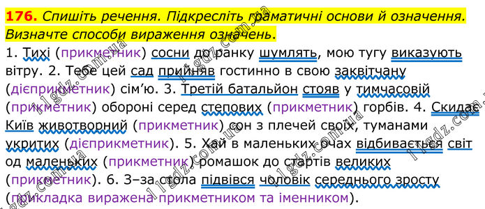 176. Спишіть речення. Підкресліть граматичні основи й означення. Визначте способи вираження означень. 1. Тихі (прикметник) сосни до ранку шумлять, мою тугу виказують вітру. 2. Тебе цей сад прийняв гостинно в свою заквітчану (дієприкметник) сім’ю. 3. Третій батальйон стояв у тимчасовій (прикметник) обороні серед степових (прикметник) горбів. 4. Скидає Київ животворний (прикметник) сон з плечей своїх, туманами укритих (дієприкметник). 5. Хай в маленьких очах відбивається світ од маленьких (прикметник) ромашок до стартів великих (прикметник). 6. З–за стола підвівся чоловік середнього зросту (прикладка виражена прикметником та іменником).