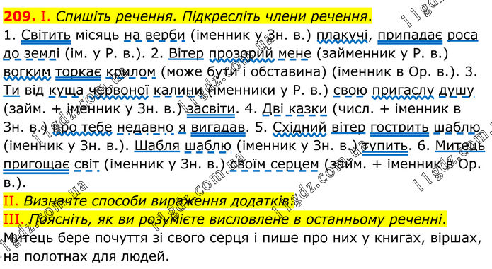 209. І. Спишіть речення. Підкресліть члени речення. 1. Світить місяць на верби (іменник у Зн. в.) плакучі, припадає роса до землі (ім. у Р. в.). 2. Вітер прозорий мене (займенник у Р. в.) вогким торкає крилом (може бути і обставина) (іменник в Ор. в.). 3. Ти від куща червоної калини (іменники у Р. в.) свою пригаслу душу (займ. + іменник у Зн. в.) засвіти. 4. Дві казки (числ. + іменник в Зн. в.) про тебе недавно я вигадав. 5. Східний вітер гострить шаблю (іменник у Зн. в.). Шабля шаблю (іменник у Зн. в.) тупить. 6. Митець пригощає світ (іменник у Зн. в.) своїм серцем (займ. + іменник в Ор. в.). II. Визначте способи вираження додатків. III. Поясніть, як ви розумієте висловлене в останньому реченні. Митець бере почуття зі свого серця і пише про них у книгах, віршах, на полотнах для людей.
