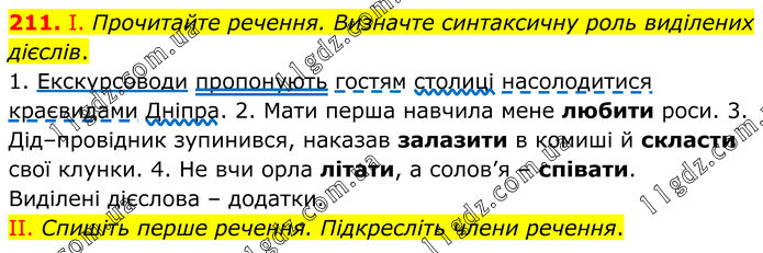 211. І. Прочитайте речення. Визначте синтаксичну роль виділених дієслів. 1. Екскурсоводи пропонують гостям столиці насолодитися краєвидами Дніпра. 2. Мати перша навчила мене любити роси. 3. Дід–провідник зупинився, наказав залазити в комиші й скласти свої клунки. 4. Не вчи орла літати, а солов’я – співати. Виділені дієслова – додатки. II. Спишіть перше речення. Підкресліть члени речення.