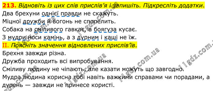 213. Відновіть із цих слів прислів’я і запишіть. Підкресліть додатки. Два брехуни однієї правди не скажуть. Міцної дружби й вогонь не спопелить. Собака на сміливого гавкає, а боягуза кусає. З мудри носи камінь, а з дурним і каші не їж. II. Поясніть значення відновлених прислів’їв. Брехня завжди різна. Дружба проходить всі випробування. Сміливу людину не чіпають, але казати можуть що завгодно. Мудра людина корисна тобі навіть важкими справами чи порадами, а дурень — завжди не принесе користі.