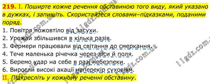 219. І. Поширте кожне речення обставиною того виду, який указано в дужках, і запишіть. Скористайтеся словами–підказками, поданими поряд. 1. Повітря пожовтіло від засухи. 2. Урожай збільшився в кілька разів. 3. Фермери працювали від світання до смеркання. 4. Тече маленька річечка через ліси й поля. 5. Беремо удар на себе в разі небезпеки. 6. Виросли високі акації наперекір суховіям. II. Підкресліть у кожному реченні обставину.