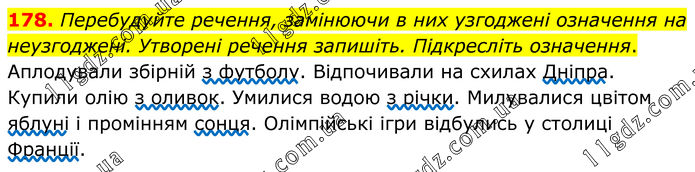 178. Перебудуйте речення, замінюючи в них узгоджені означення на неузгоджені. Утворені речення запишіть. Підкресліть означення. Аплодували збірній з футболу. Відпочивали на схилах Дніпра. Купили олію з оливок. Умилися водою з річки. Милувалися цвітом яблуні і промінням сонця. Олімпійські ігри відбулись у столиці Франції.
