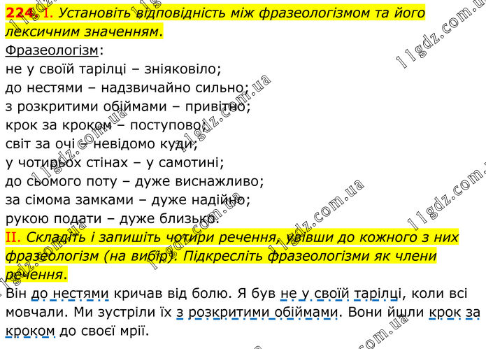 224. І. Установіть відповідність між фразеологізмом та його лексичним значенням. Фразеологізм: не у своїй тарілці – зніяковіло; до нестями – надзвичайно сильно; з розкритими обіймами – привітно; крок за кроком – поступово; світ за очі – невідомо куди; у чотирьох стінах – у самотині; до сьомого поту – дуже виснажливо; за сімома замками – дуже надійно; рукою подати – дуже близько. II. Складіть і запишіть чотири речення, увівши до кожного з них фразеологізм (на вибір). Підкресліть фразеологізми як члени речення. Він до нестями кричав від болю. Я був не у своїй тарілці, коли всі мовчали. Ми зустріли їх з розкритими обіймами. Вони йшли крок за кроком до своєї мрії.
