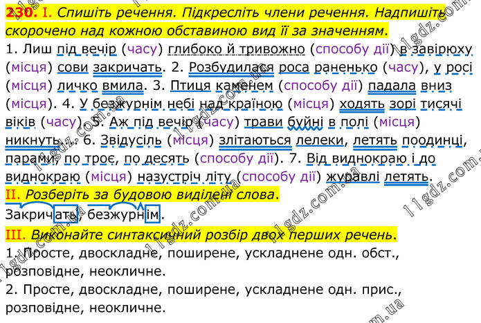 230. І. Спишіть речення. Підкресліть члени речення. Надпишіть скорочено над кожною обставиною вид її за значенням. 1. Лиш під вечір (часу) глибоко й тривожно (способу дії) в завірюху (місця) сови закричать. 2. Розбудилася роса раненько (часу), у росі (місця) личко вмила. 3. Птиця каменем (способу дії) падала вниз (місця). 4. У безжурнім небі над країною (місця) ходять зорі тисячі віків (часу). 5. Аж під вечір (часу) трави буйні в полі (місця) никнуть.... 6. Звідусіль (місця) злітаються лелеки, летять поодинці, парами, по троє, по десять (способу дії). 7. Від виднокраю і до виднокраю (місця) назустріч літу (способу дії) журавлі летять. II. Розберіть за будовою виділені слова. Закричать, безжурнім. III. Виконайте синтаксичний розбір двох перших речень. 1. Просте, двоскладне, поширене, ускладнене одн. обст., розповідне, неокличне. 2. Просте, двоскладне, поширене, ускладнене одн. прис., розповідне, неокличне.