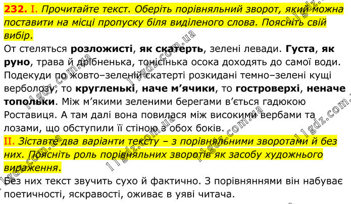 232. І. Прочитайте текст. Оберіть порівняльний зворот, який можна поставити на місці пропуску біля виділеного слова. Поясніть свій вибір. От стеляться розложисті, як скатерть, зелені левади. Густа, як руно, трава й дрібненька, тонісінька осока доходять до самої води. Подекуди по жовто–зеленій скатерті розкидані темно–зелені кущі верболозу, то кругленькі, наче м’ячики, то гостроверхі, неначе топольки. Між м’якими зеленими берегами в’ється гадюкою Роставиця. А там далі вона повилася між високими вербами та лозами, що обступили її стіною з обох боків. II. Зіставте два варіанти тексту – з порівняльними зворотами й без них. Поясніть роль порівняльних зворотів як засобу художнього вираження. Без них текст звучить сухо й фактично. З порівняннями він набуває поетичності, яскравості, оживає в уяві читача.