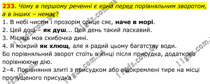 233. Чому в першому реченні є кома перед порівняльним зворотом, а в інших – немає? 1. В небі чистім і прозорім сонце сяє, наче в морі. 2. Цей дощ – як душ... Цей день такий ласкавий. 3. Місяць мов скибочка дині. 4. Я мокрий як хлющ, але я радий цьому багатству води. Бо порівняльний зворот стоїть в кінці після присудка, додатково порівнюючи дію. 2–4. Порівняння злиті з присудком або відокремлені тире на місці пропущеного присудка.