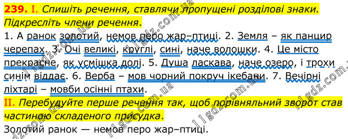 239. І. Спишіть речення, ставлячи пропущені розділові знаки. Підкресліть члени речення. 1. А ранок золотий, немов перо жар–птиці. 2. Земля – як панцир черепах. 3. Очі великі, круглі, сині, наче волошки. 4. Це місто прекрасне, як усмішка долі. 5. Душа ласкава, наче озеро, і трохи синім віддає. 6. Верба – мов чорний покруч ікебани. 7. Вечірні ліхтарі – мовби осінні птахи. II. Перебудуйте перше речення так, щоб порівняльний зворот став частиною складеного присудка. Золотий ранок — немов перо жар–птиці.