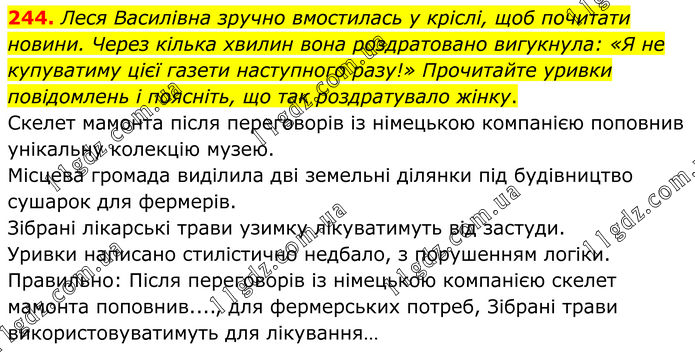 244. Леся Василівна зручно вмостилась у кріслі, щоб почитати новини. Через кілька хвилин вона роздратовано вигукнула: «Я не купуватиму цієї газети наступного разу!» Прочитайте уривки повідомлень і поясніть, що так роздратувало жінку. Скелет мамонта після переговорів із німецькою компанією поповнив унікальну колекцію музею. Місцева громада виділила дві земельні ділянки під будівництво сушарок для фермерів. Зібрані лікарські трави узимку лікуватимуть від застуди. Уривки написано стилістично недбало, з порушенням логіки. Правильно: Після переговорів із німецькою компанією скелет мамонта поповнив...., для фермерських потреб, Зібрані трави використовуватимуть для лікування…
