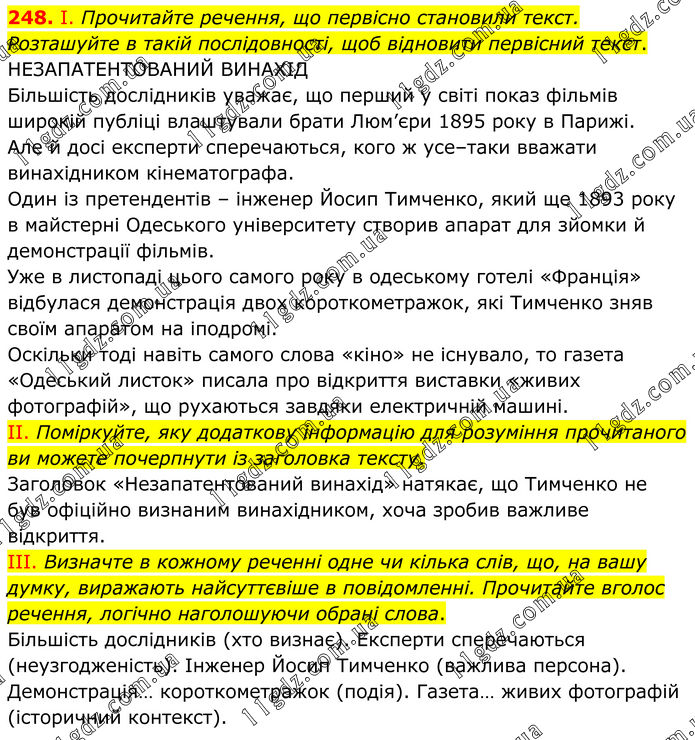 248. І. Прочитайте речення, що первісно становили текст. Розташуйте в такій послідовності, щоб відновити первісний текст. НЕЗАПАТЕНТОВАНИЙ ВИНАХІД Більшість дослідників уважає, що перший у світі показ фільмів широкій публіці влаштували брати Люм’єри 1895 року в Парижі. Але й досі експерти сперечаються, кого ж усе–таки вважати винахідником кінематографа. Один із претендентів – інженер Йосип Тимченко, який ще 1893 року в майстерні Одеського університету створив апарат для зйомки й демонстрації фільмів. Уже в листопаді цього самого року в одеському готелі «Франція» відбулася демонстрація двох короткометражок, які Тимченко зняв своїм апаратом на іподромі. Оскільки тоді навіть самого слова «кіно» не існувало, то газета «Одеський листок» писала про відкриття виставки «живих фотографій», що рухаються завдяки електричній машині. II. Поміркуйте, яку додаткову інформацію для розуміння прочитаного ви можете почерпнути із заголовка тексту. Заголовок «Незапатентований винахід» натякає, що Тимченко не був офіційно визнаним винахідником, хоча зробив важливе відкриття. III. Визначте в кожному реченні одне чи кілька слів, що, на вашу думку, виражають найсуттєвіше в повідомленні. Прочитайте вголос речення, логічно наголошуючи обрані слова. Більшість дослідників (хто визнає). Експерти сперечаються (неузгодженість). Інженер Йосип Тимченко (важлива персона). Демонстрація… короткометражок (подія). Газета… живих фотографій (історичний контекст).
