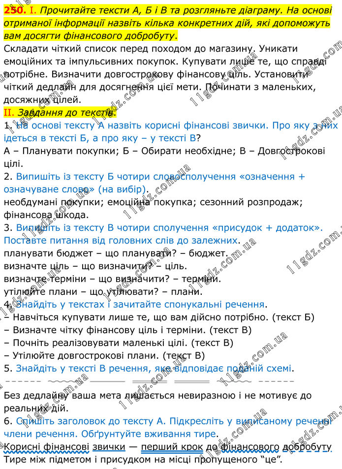 250. І. Прочитайте тексти А, Б і В та розгляньте діаграму. На основі отриманої інформації назвіть кілька конкретних дій, які допоможуть вам досягти фінансового добробуту. Складати чіткий список перед походом до магазину. Уникати емоційних та імпульсивних покупок. Купувати лише те, що справді потрібне. Визначити довгострокову фінансову ціль. Установити чіткий дедлайн для досягнення цієї мети. Починати з маленьких, досяжних цілей. II. Завдання до текстів. 1. На основі тексту А назвіть корисні фінансові звички. Про яку з них ідеться в тексті Б, а про яку – у тексті В? А – Планувати покупки; Б – Обирати необхідне; В – Довгострокові цілі. 2. Випишіть із тексту Б чотири словосполучення «означення + означуване слово» (на вибір). необдумані покупки; емоційна покупка; сезонний розпродаж; фінансова шкода. 3. Випишіть із тексту В чотири сполучення «присудок + додаток». Поставте питання від головних слів до залежних. планувати бюджет – що планувати? – бюджет. визначте ціль – що визначити? – ціль. визначте терміни – що визначити? – терміни. утілюйте плани – що утілювати? – плани. 4. Знайдіть у текстах і зачитайте спонукальні речення. – Навчіться купувати лише те, що вам дійсно потрібно. (текст Б) – Визначте чітку фінансову ціль і терміни. (текст В) – Почніть реалізовувати маленькі цілі. (текст В) – Утілюйте довгострокові плани. (текст В) 5. Знайдіть у тексті В речення, яке відповідає поданій схемі. Без дедлайну ваша мета лишається невиразною і не мотивує до реальних дій. 6. Спишіть заголовок до тексту А. Підкресліть у виписаному реченні члени речення. Обґрунтуйте вживання тире. Корисні фінансові звички — перший крок до фінансового добробуту Тире між підметом і присудком на місці пропущеного “це”.