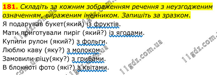 181. Складіть за кожним зображенням речення з неузгодженим означенням, вираженим іменником. Запишіть за зразком. Я подарував букет(який) із фруктів. Мати приготували пиріг (який?) із ягодами. Купили рулон (який?) з фольги. Люблю каву (яку?) з молоком. Замовили піцу(яку?) з грибами. В блокноті фото (які?) з квітами.