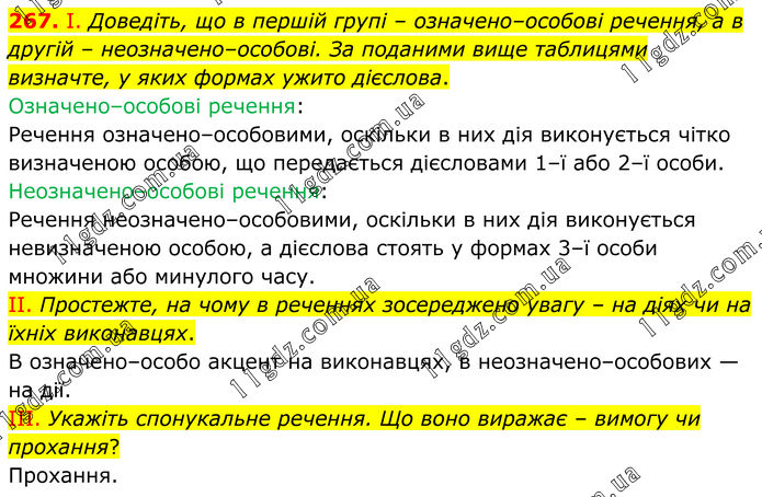 267. І. Доведіть, що в першій групі – означено–особові речення, а в другій – неозначено–особові. За поданими вище таблицями визначте, у яких формах ужито дієслова. Означено–особові речення: Речення означено–особовими, оскільки в них дія виконується чітко визначеною особою, що передається дієсловами 1–ї або 2–ї особи. Неозначено–особові речення: Речення неозначено–особовими, оскільки в них дія виконується невизначеною особою, а дієслова стоять у формах 3–ї особи множини або минулого часу. II. Простежте, на чому в реченнях зосереджено увагу – на діях чи на їхніх виконавцях. В означено–особо акцент на виконавцях, в неозначено–особових — на дії. III. Укажіть спонукальне речення. Що воно виражає – вимогу чи прохання? Прохання.