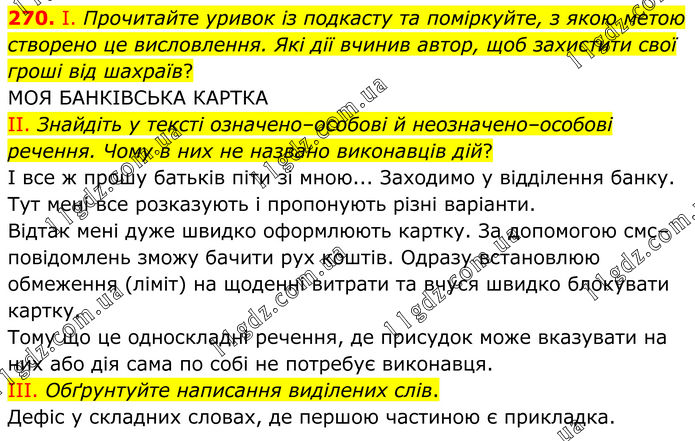 270. І. Прочитайте уривок із подкасту та поміркуйте, з якою метою створено це висловлення. Які дії вчинив автор, щоб захистити свої гроші від шахраїв? МОЯ БАНКІВСЬКА КАРТКА II. Знайдіть у тексті означено–особові й неозначено–особові речення. Чому в них не названо виконавців дій? І все ж прошу батьків піти зі мною... Заходимо у відділення банку. Тут мені все розказують і пропонують різні варіанти. Відтак мені дуже швидко оформлюють картку. За допомогою смс–повідомлень зможу бачити рух коштів. Одразу встановлюю обмеження (ліміт) на щоденні витрати та вчуся швидко блокувати картку. Тому що це односкладні речення, де присудок може вказувати на них або дія сама по собі не потребує виконавця. III. Обґрунтуйте написання виділених слів. Дефіс у складних словах, де першою частиною є прикладка.
