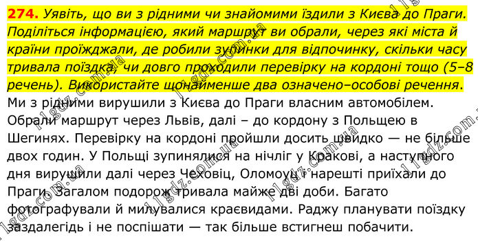 274. Уявіть, що ви з рідними чи знайомими їздили з Києва до Праги. Поділіться інформацією, який маршрут ви обрали, через які міста й країни проїжджали, де робили зупинки для відпочинку, скільки часу тривала поїздка, чи довго проходили перевірку на кордоні тощо (5–8 речень). Використайте щонайменше два означено–особові речення. Ми з рідними вирушили з Києва до Праги власним автомобілем. Обрали маршрут через Львів, далі – до кордону з Польщею в Шегинях. Перевірку на кордоні пройшли досить швидко — не більше двох годин. У Польщі зупинялися на нічліг у Кракові, а наступного дня вирушили далі через Чеховіц, Оломоуц і нарешті приїхали до Праги. Загалом подорож тривала майже дві доби. Багато фотографували й милувалися краєвидами. Раджу планувати поїздку заздалегідь і не поспішати — так більше встигнеш побачити.
