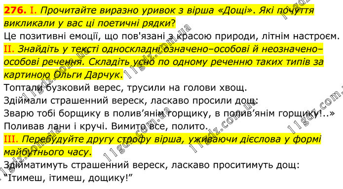 276. І. Прочитайте виразно уривок з вірша «Дощі». Які почуття викликали у вас ці поетичні рядки? Це позитивні емоції, що пов'язані з красою природи, літнім настроєм. II. Знайдіть у тексті односкладні означено–особові й неозначено–особові речення. Складіть усно по одному реченню таких типів за картиною Ольги Дарчук. Топтали бузковий верес, трусили на голови хвощ. Здіймали страшенний вереск, ласкаво просили дощ: Зварю тобі борщику в полив’янім горщику, в полив’янім горщику!..» Поливав лани і кручі. Вимито все, полито. III. Перебудуйте другу строфу вірша, уживаючи дієслова у формі майбутнього часу. Здійматимуть страшенний вереск, ласкаво проситимуть дощ: “Ітимеш, ітимеш, дощику!”