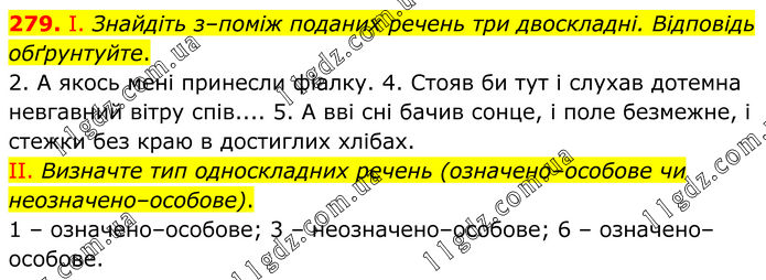 279. І. Знайдіть з–поміж поданих речень три двоскладні. Відповідь обґрунтуйте. 2. А якось мені принесли фіалку. 4. Стояв би тут і слухав дотемна невгавний вітру спів.... 5. А вві сні бачив сонце, і поле безмежне, і стежки без краю в достиглих хлібах. II. Визначте тип односкладних речень (означено–особове чи неозначено–особове). 1 – означено–особове; 3 – неозначено–особове; 6 – означено–особове.